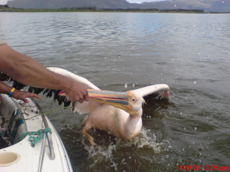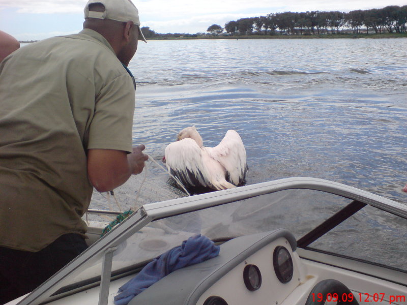 I proceeded to the rowing club with a bunch of exited boys to see what was on the go. We were told that there was a pelican caught up in fishing line that needed to be rescued. So off we went to free the bird. Byron said he would catch