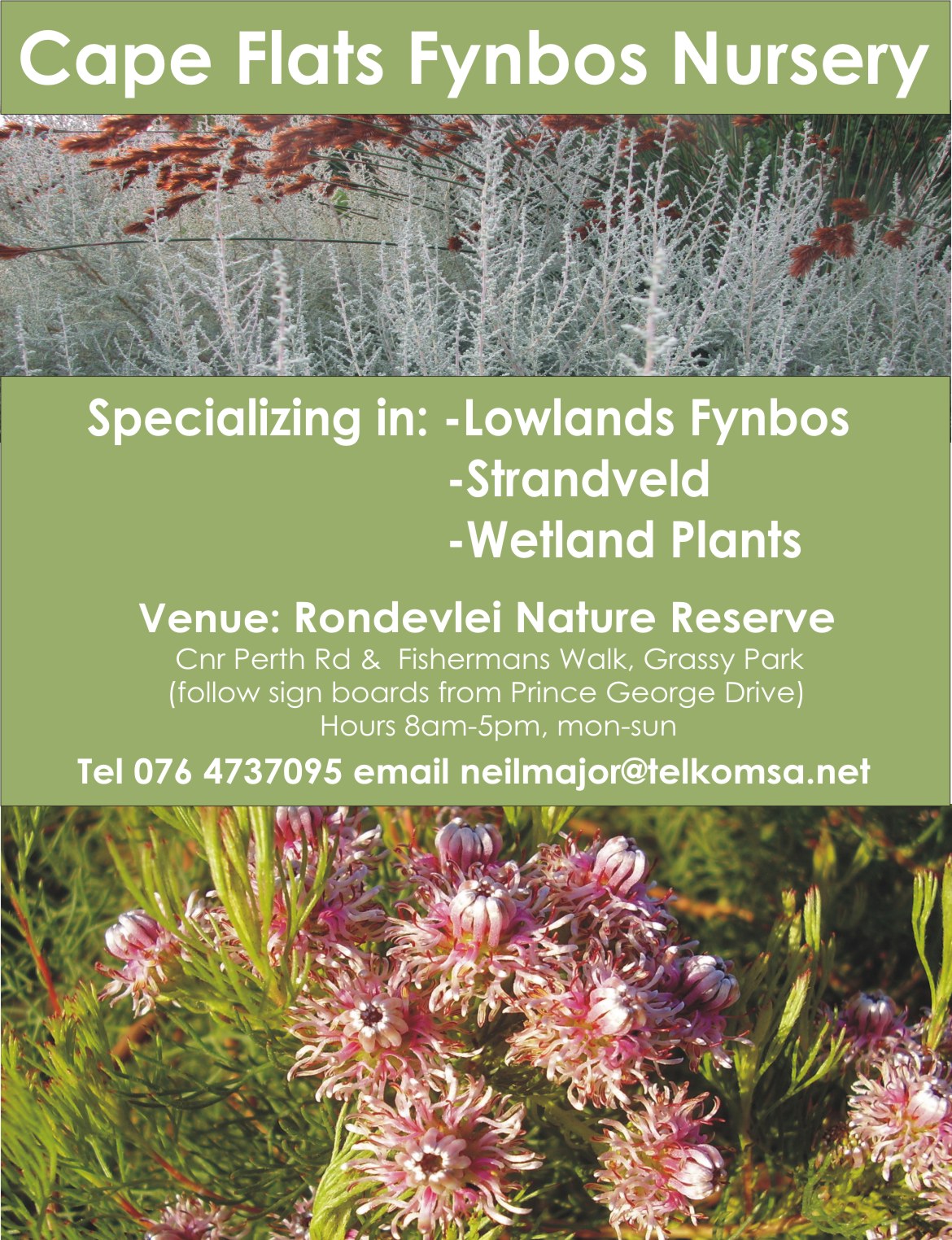 Visit the Cape Flats Fynbos Nursery at Rondevlei Nature Reserve for a range of locally indigenous plants. They are arranged according to three vegetation types: Strandveld, Sand fynbos and Wetlands. All of these do well at Zeekoevlei, depending on the situation.   Happy Gardening!