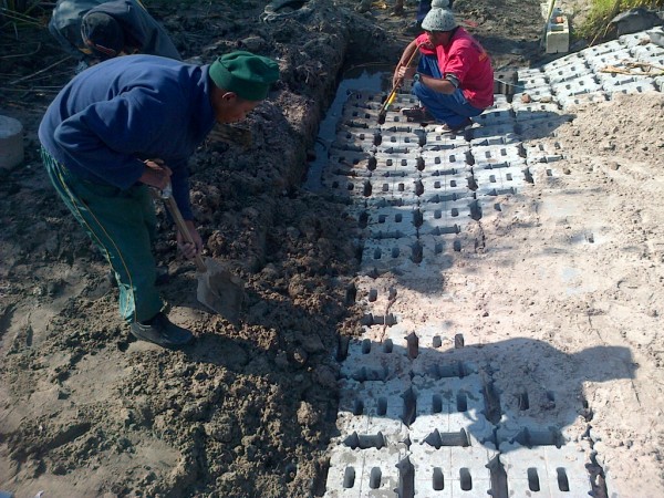 Plants can be planted between the small gaps to further stabilize the embankments. The slope angle is variable from steep to very gentle with the bottom block embedded into the vlei. The Earthblocks are linked together with 4mm galvanized wire and pegged at the bottom for additional stability.