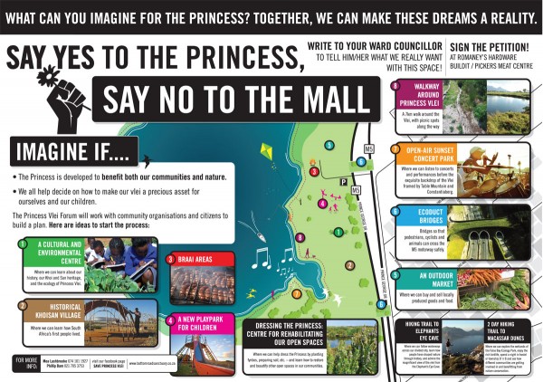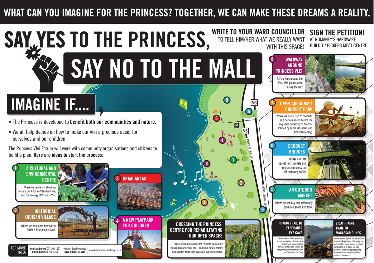 16th June 2pm, Princess Vlei , Prince George Drive, Grassy Park. To coincide with Youth Day Celebrations and view the People’s Plan for Princess Vlei. Public of all ages are invited to share their ideas at this opportunity for a creative expression of our future. Bring your picnics and braais, banners and hand-made posters. Guest speakers, poetry, prayer, art and music. For easy access, find parking in main Vlei car park and also on Sasmeer Road, Retreat. Tel Mea 074 101 1927