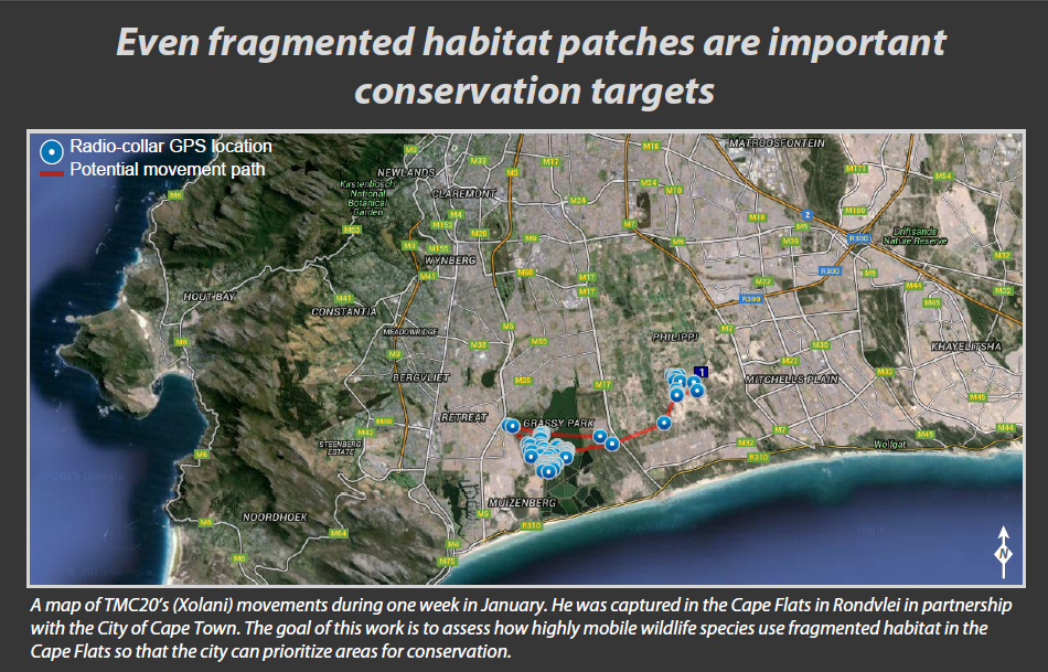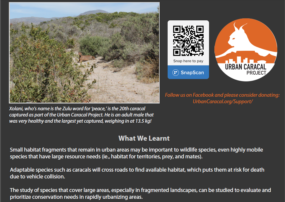 Caracal were exterminated from the Cape Flats and we re-introduced them at Rondevlei between 1998 – 1999 when I received animals from Table Mountain. The attached satellite track of the animals movements show he has been able to move through the urban environment, across Strandfontein Road and into the southern end of Phillipi. You can keep track of Xolani’s movements and the Urban Caracal Project via their website details below.
