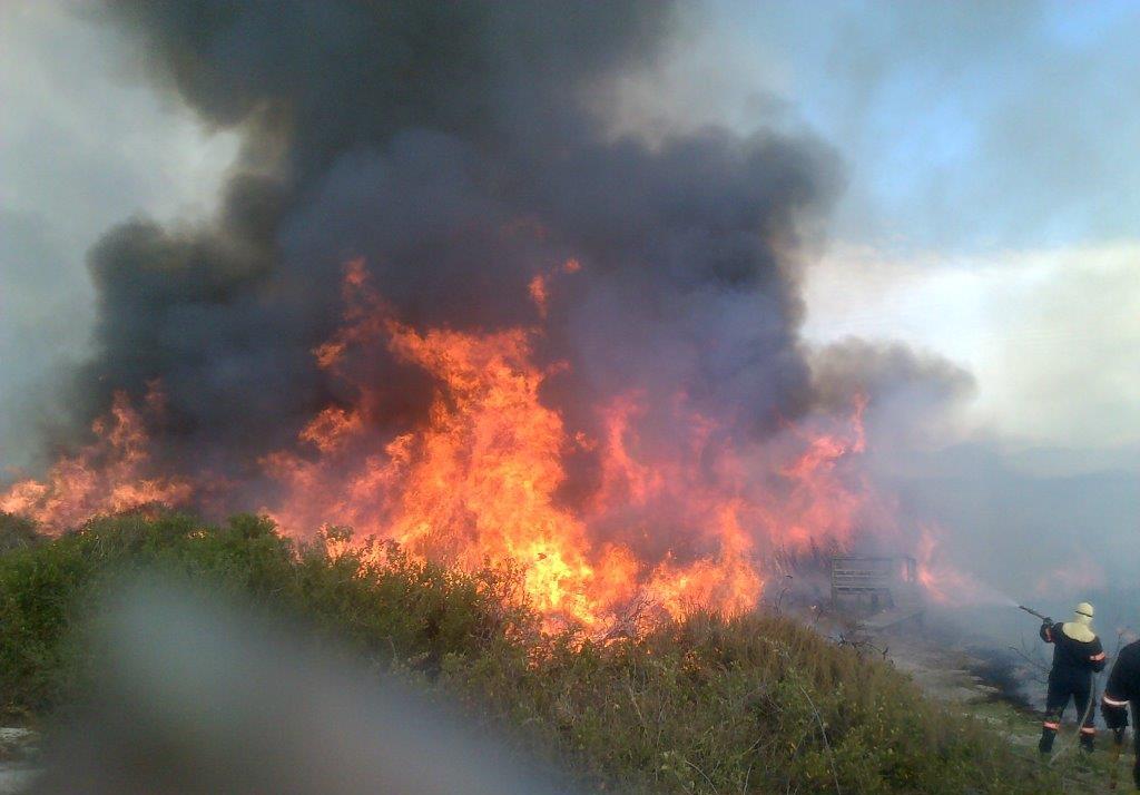 The next three photographs demonstrate how fire prone vegetation can be. This indigenous Cliffortia plant (the green bush) is growing in wet vlei conditions yet in its green state it will burn vigorously.