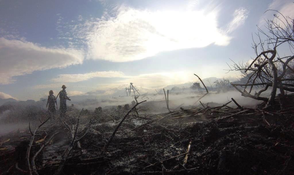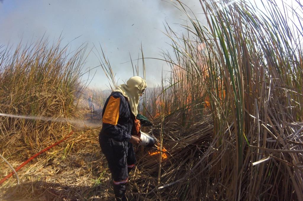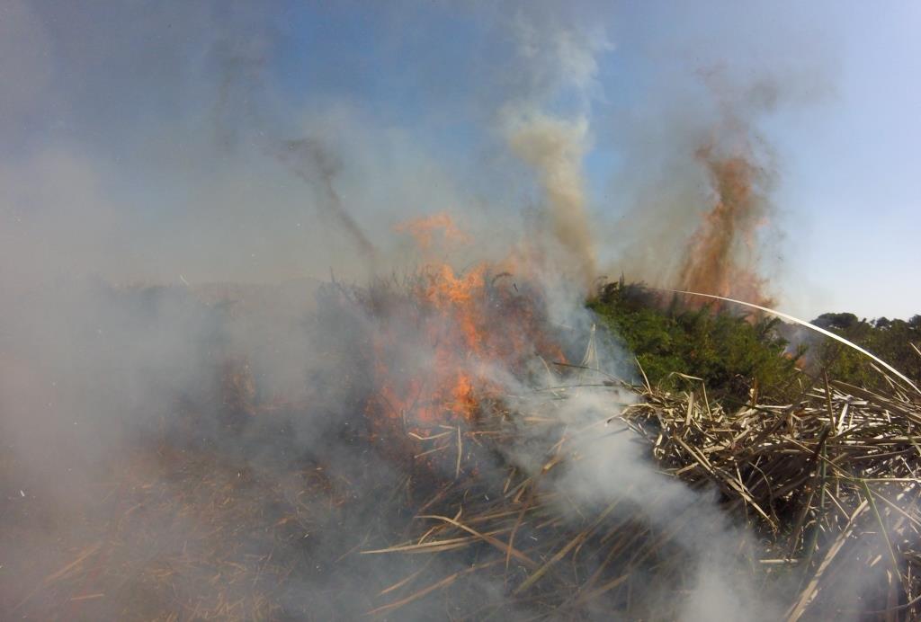 The initial reed beds being lit. Bulrush reed beds are very fire prone and will recover quickly from their root bases after a fire.
