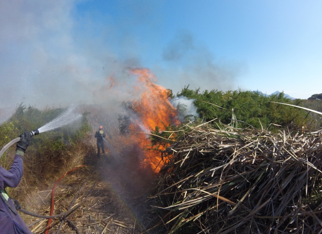 The ecological burn of the eastern shoreline of Rondevlei was successfully completed last week; with a cold front coming on behind and reducing the amount of time needed to manage the fire. Some pictures below show scenes from the ecological burn. The area that was burnt had vegetation that was mostly 40 years+; where as more natural conditions have a fire driven landscape of 10 – 20 years. Thank you to all residents who put up with the smoke, vehicles and business on the roads. Several people have asked for some feed back on this burn so I have posted some pictures here.